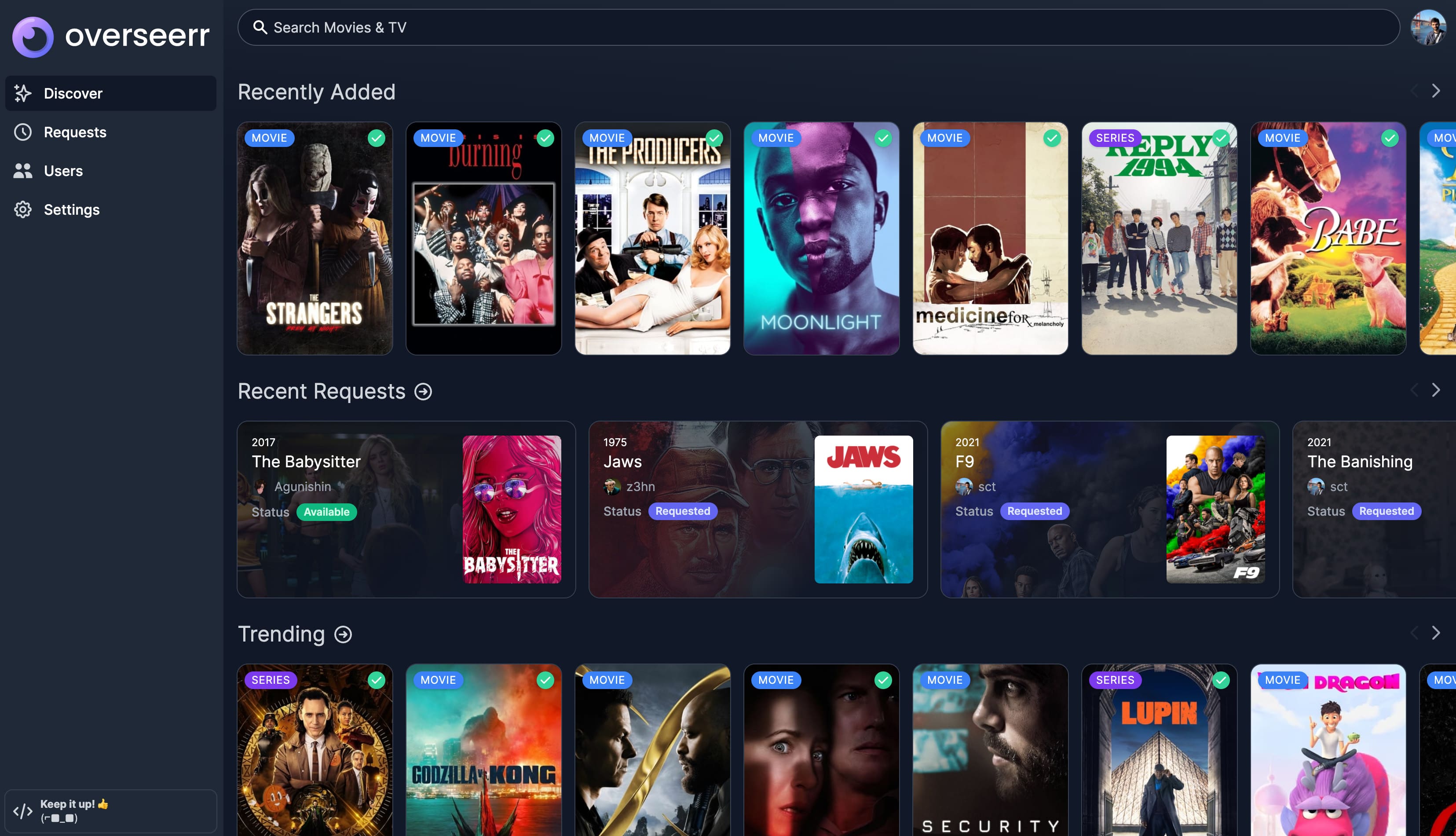 Overseerr is a free and open source software application for managing requests for your media library. It integrates with your existing services, such as Sonarr, Radarr, and Plex!